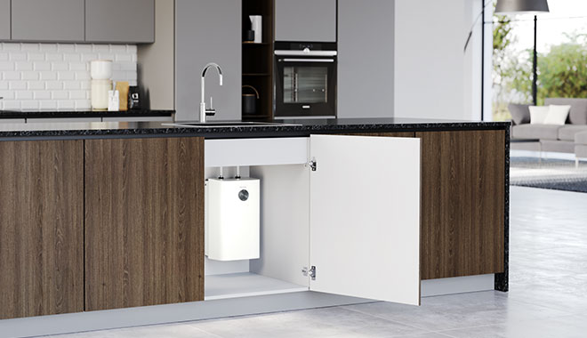 The Design-Kollektion Goose Mixer is designed for seamless integration with the SNU Plus open-vented storage water heater. It provides controlled hot and cold water delivery without requiring a central hot water system, making it ideal for isolated sinks.